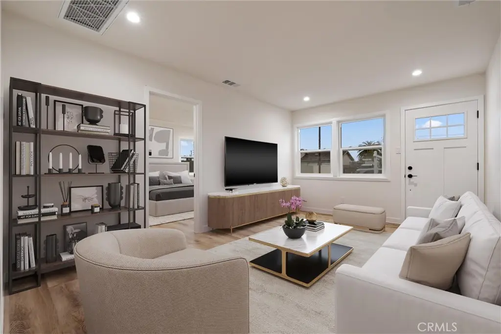 Step into a bright, open living area featuring recessed lighting that adds a warm, welcoming glow. The brand-new kitchen steals the spotlight with its sleek white shaker cabinets, polished quartz countertops, and modern appliances—perfect for both everyday living and entertaining. Freshly painted walls and new floors flow effortlessly throughout, giving the entire home a crisp, modern vibe.
