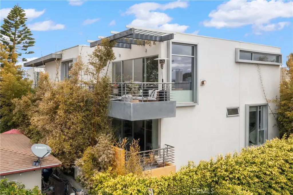 Located away from the street, this award-winning modern townhome is within walking distance to the beach, downtown Manhattan Beach and the Manhattan Beach Pier. You’ll be pleasantly surprised – your experience is all about presiding high above the prestigious Hill Section, taking-in the sun and the beautiful panoramic southwesterly treetop views, sunsets and cool ocean breezes from the floor to ceiling doors and windows. It’s gorgeous! You’ll feel like you’re above it all from this quiet and stylish end-unit townhome without interior influence from the street. Part of a unique mixed-use offering, this private hideaway is the rear unit of two townhomes, with offices facing the street. It’s perfect for active professionals and executives looking for the ultimate So Cal beach lifestyle, convenience and style in one place. Inspired by Dutch Artist Piet Mondrian, the property received a Design Award in 2007 from AIA Long Beach/South Bay. Sleek high-end finishes include Caesarstone in the kitchen and baths, hardwood floors, stainless steel Jenn-Air and KitchenAid appliances, Grohe fixtures, Pedini Italian Cabinetry, black-out shades in the primary bedroom, and a decorative gas fireplace that provides warmth and ambiance. The upper level features the ultimate great room that must be experienced in person to fully appreciate. Sunshine fills the room through the west-facing wall of windows and leads you to a wonderful outdoor deck. Also on the upper level is a multi-purpose 3rd bedroom, guest suite or live-work office with its own private entrance. On the mid-level, you’ll find two huge bedrooms with private en-suite baths and a laundry room. The primary suite opens to a bamboo landscaped deck and features a walk-in closet, chic bath with double vanity, shower with rainhead and body sprayers plus a jetted tub. The lower level provides direct access to the 2 car garage and guest parking. Common area amenities include a convenient elevator and a roof deck lounge space. Don’t miss out on this unique opportunity to experience Beachside Modern Living Redefined!